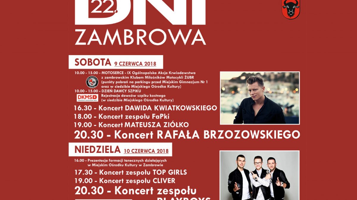 9 – 10 czerwca 2018r. odbędą się 22 Dni Zambrowa. Wysąpi między innymi Dawid Kwiatkowski, Mateusz Ziółko, Rafał Brzozowski oraz gwiazdy sceny disco polo zespoły: Top Girls, Cliver oraz Playboys.