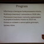 Spotkanie było okazją do omówienia funkcjonowania miasta, sprawozdania z wykonanych inwestycji i remontów w roku bieżącym oraz przedstawienia planu przedsięwzięć na 2019 rok. Burmistrz poinformował także o zmianach w ustawie o samorządzie gminnym.