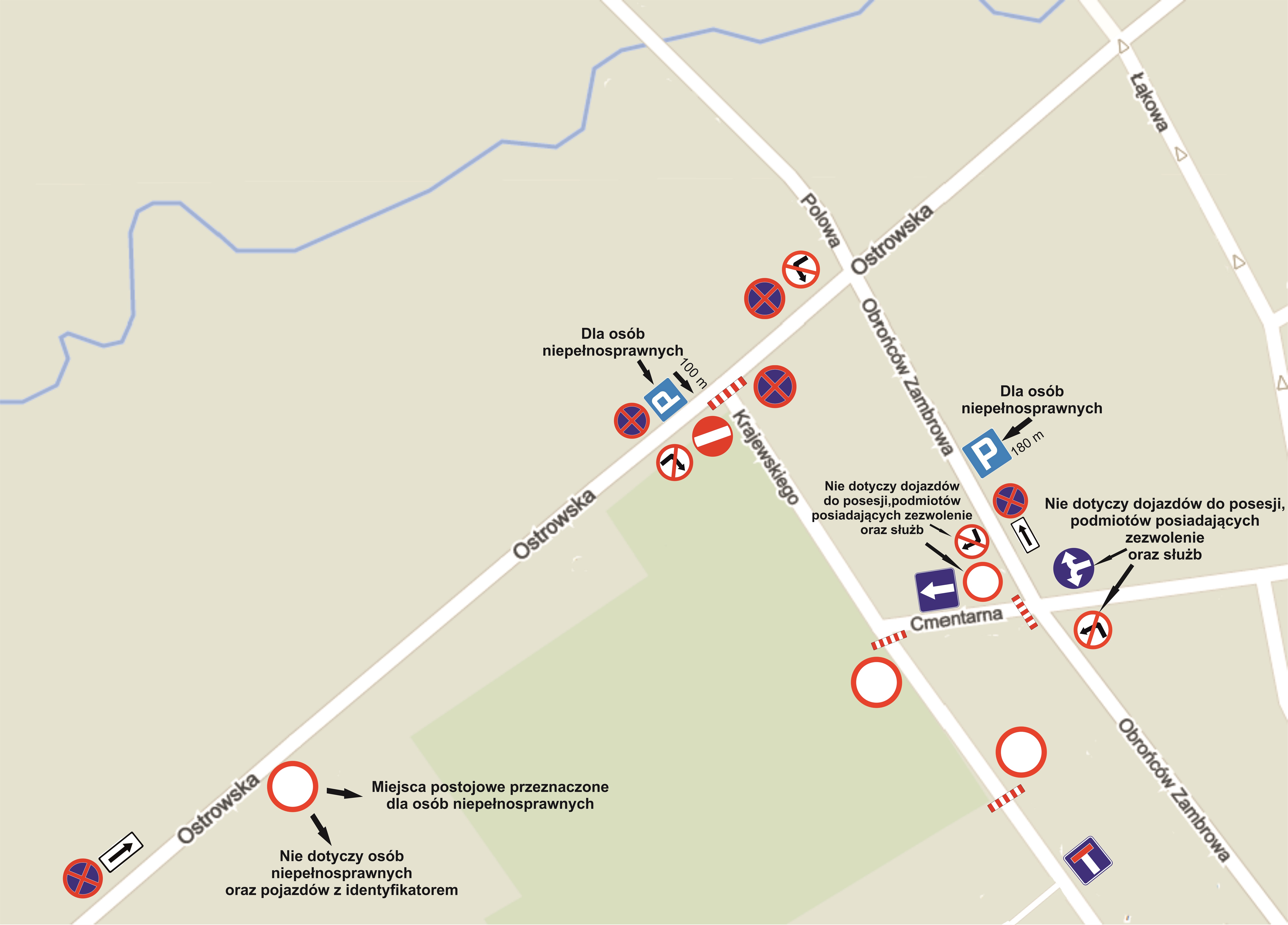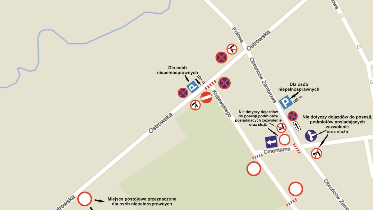 – ulica Cmentarna od skrzyżowania z ulicą Obrońców Zambrowa do skrzyżowania ul. Krajewskiego z ul. Ostrowską będzie ulicą jednokierunkową,