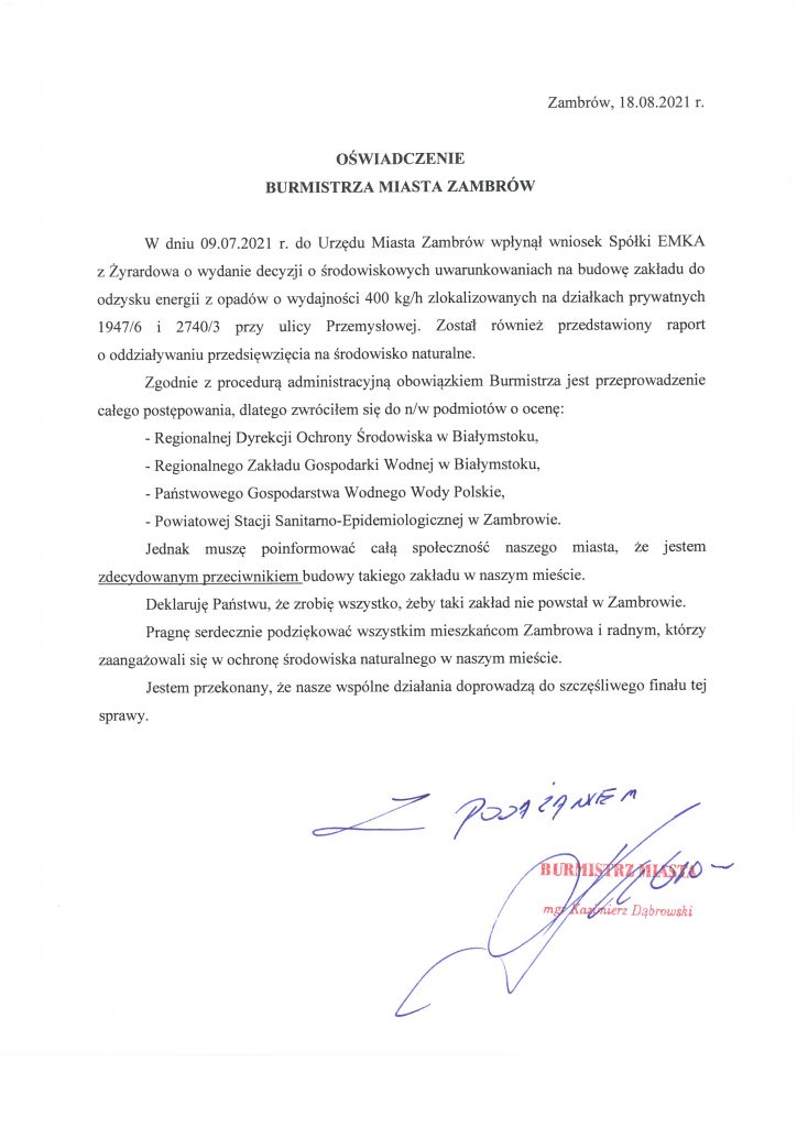 24.08.2021 o godz. 18.00 TRANSMISJA NA ŻYWO ze spotkania Burmistrza Miasta Zambrów i Radnych Rady Miasta Zambrów z przedstawicielami Spółki EMKA z Żyrardowa