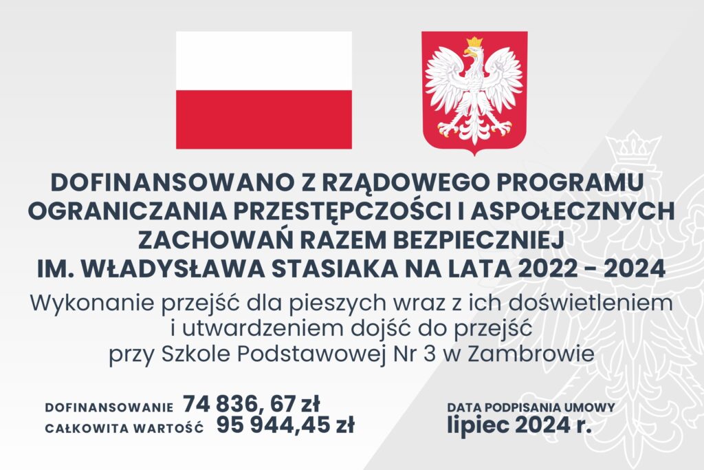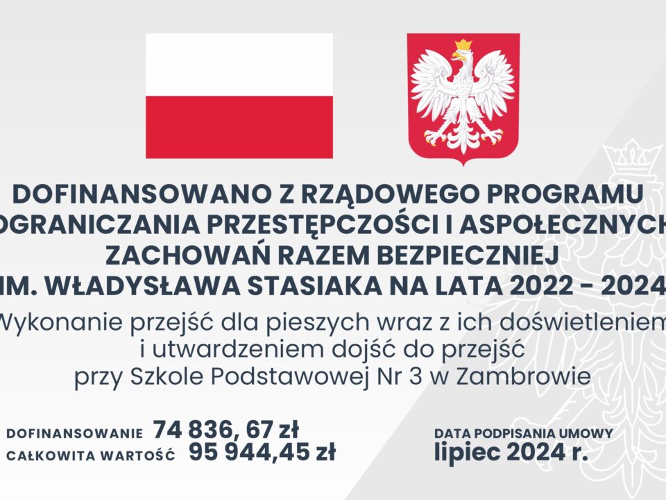 „Wykonanie przejść dla pieszych wraz z ich doświetleniem i utwardzeniem dojść do przejść przy drodze wewnętrznej do Szkoły Podstawowej Nr 3 w Zambrowie wraz z działaniami edukacyjnymi dla bezpieczeństwa w zakresie ruchu drogowego”.
