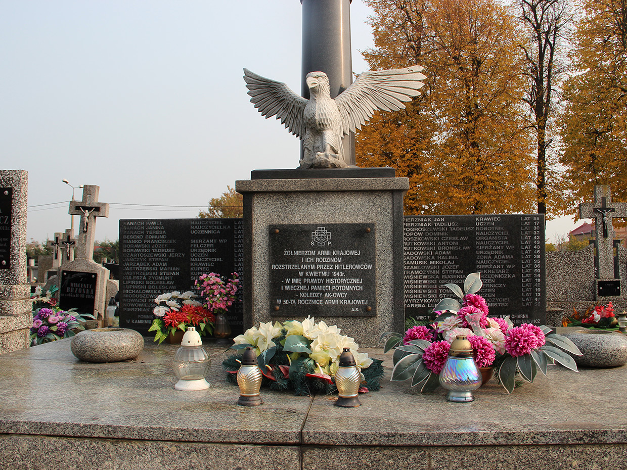 Pomnik nagrobny wystawiony ofiarom zbrodni hitlerowskich, dokonanych w kwietniu 1943 roku, wybudowany ze składek uzbieranych przez rodziny pomordowanych około 1948 roku. W 1993 roku wmurowano tablicę, upamiętniającą 50-ta rocznicę powstania Armii Krajowej.